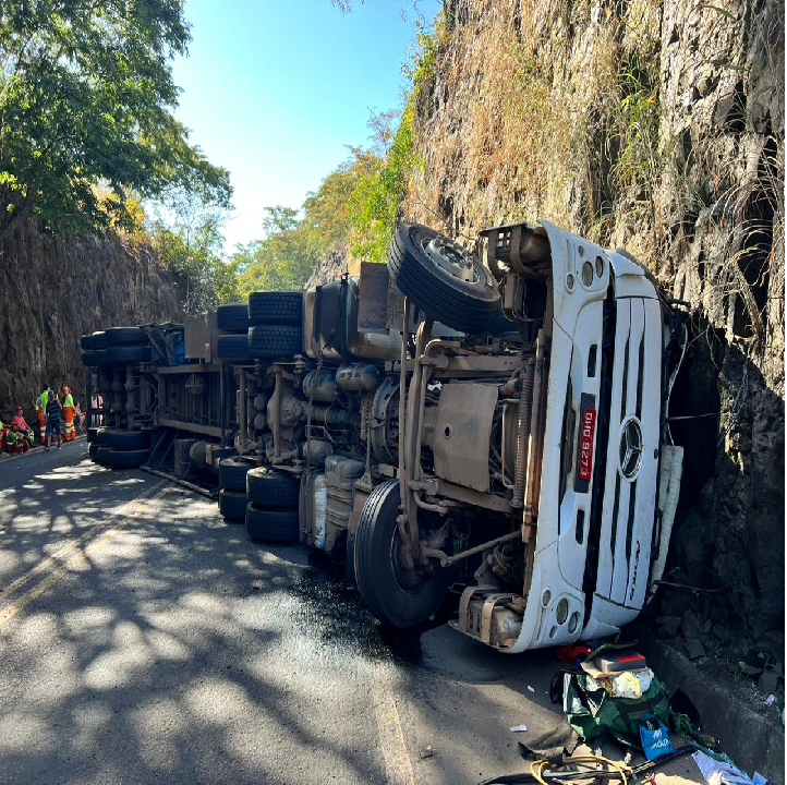 Em contato com o condutor do caminhão, E.P.S. 54 anos, este relatou que ao fazer a curva perdeu o controle veicular, vindo a CVC a tombar e atingir o veículo permanecendo estabilizada, bloqueando totalmente a via.